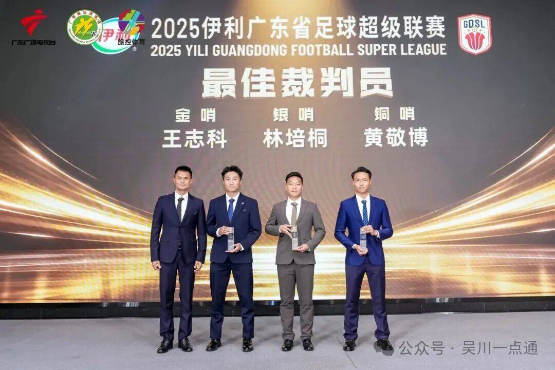 裁判团队同样获得高度认可——2025年中超“金哨”李海新授予最佳裁判员奖(金、银、铜哨三人)——获奖者王志科、林培桐、黄敬博;中国足协重返国际足联后的首位国际级裁判钟博宏授予最佳助理裁判奖(金、银、铜旗三人)——获奖者罗森威、黄龙、马小义,彰显了赛事执裁的专业水准。