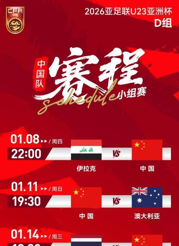 具体赛程安排是:1月8日晚22:00对阵伊拉克;1月11日晚19:30对阵澳大利亚;1月14日晚19:30对阵泰国。
