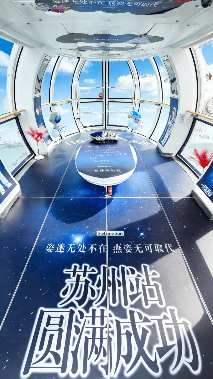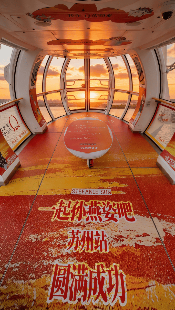 依托亚洲最大水上摩天轮的128米高空视野,特别升级打造“日落”与“飞瀑而下”双主题应援舱,游客可任选其一打卡,在360°饱览姑苏城景与金鸡湖风光的同时,在空中定格专属应援瞬间,留下独一无二的青春纪念。