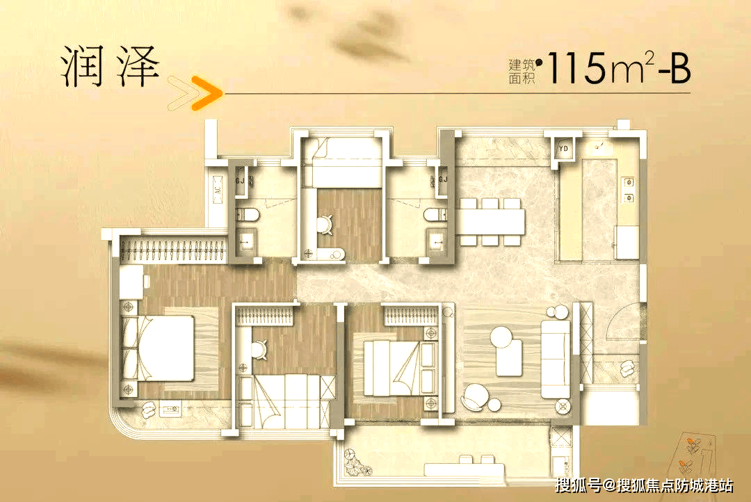 对于追求更高生活品质的改善型家庭,天河润府提供了115平方米与130平方米的四房两厅两卫户型。115平方米的户型主打改善体验,采用了五开间朝南的设计,配合南北对流,形成了极佳的微气候环境。LDKG(客餐厨阳)一体化设计,打造了一个超过60平方米的家庭核心区。这里是家庭活动的中心,无论是聚餐、聊天、游戏还是观影,都能容纳得下。部分卧室可打通的设计,满足了多孩家庭或居家办公的多样化需求。总价520万起,即可在天河核心区拥有如此宽敞的改善大宅。